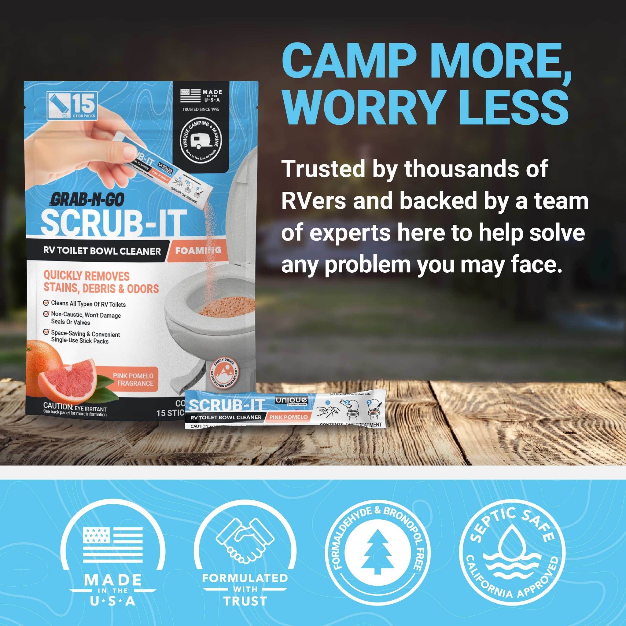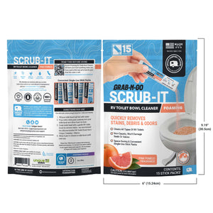 Unique Scrub-It RV Toilet Bowl Cleaner Stick Packs are an RV- and boat-safe toilet bowl cleaner formulated to remove buildup, deodorize, and leave behind long-lasting freshness while you’re out on the road. This fast-acting formula features superior foaming action that is strong enough to remove stubborn rings, stains, and debris in a pre-measured, Grab-N-Go format.