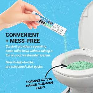 The space-saving, fuss-free stick packs make using Scrub-It RV Toilet Bowl Cleaner extremely convenient. Never deal with broken or partially-dissolved RV toilet pods or messy gel cleaners again.