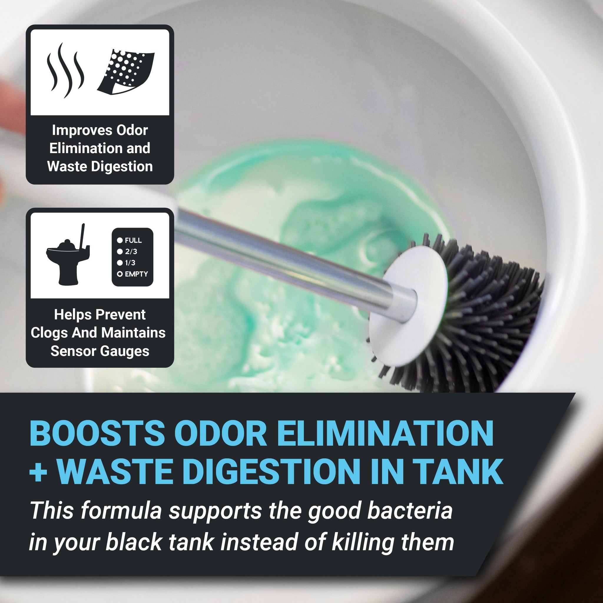 Injects beneficial bacteria and enzymes into black tanks